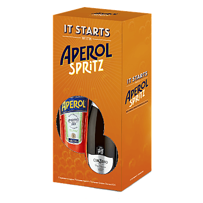 Самото име кажува се: Аперол е перфектен аперитив. Јарко портокалова боја, има уникатен вкус, благодарение на тајниот рецепт, кој никогаш не бил сменет, со инфузија на селектирани состојки, вклучително горки и благи портокали и многу други тревки и корења, искомбинирани до совршен сооднос. Сет од ликер Aperol и пенливо вино Cinzano за уживање и домашна подготовка на познатиот Aperol Spritz коктел.